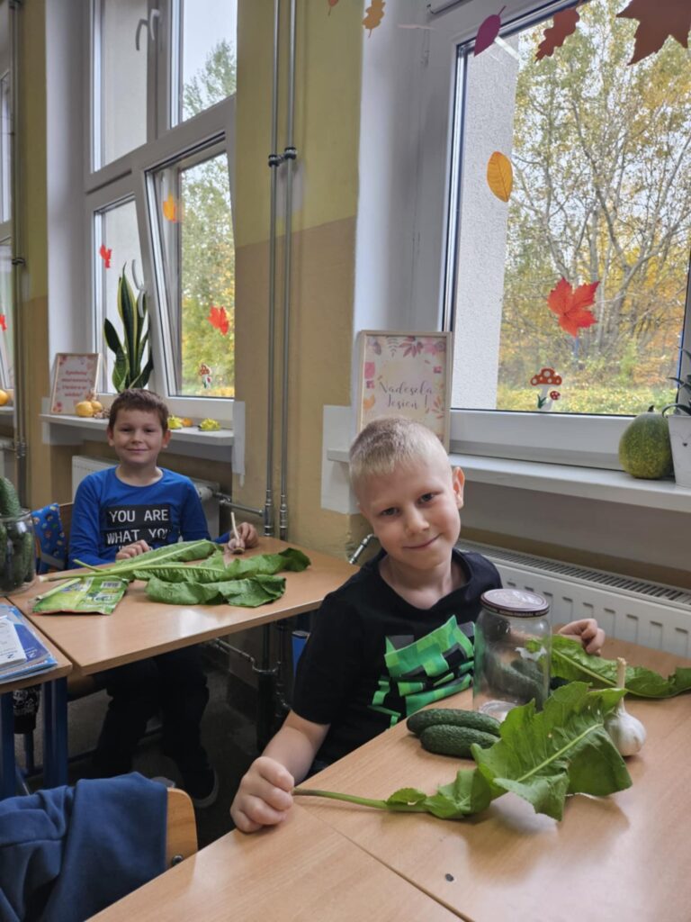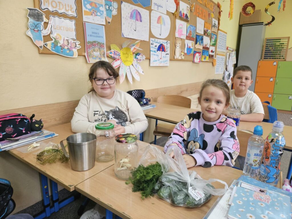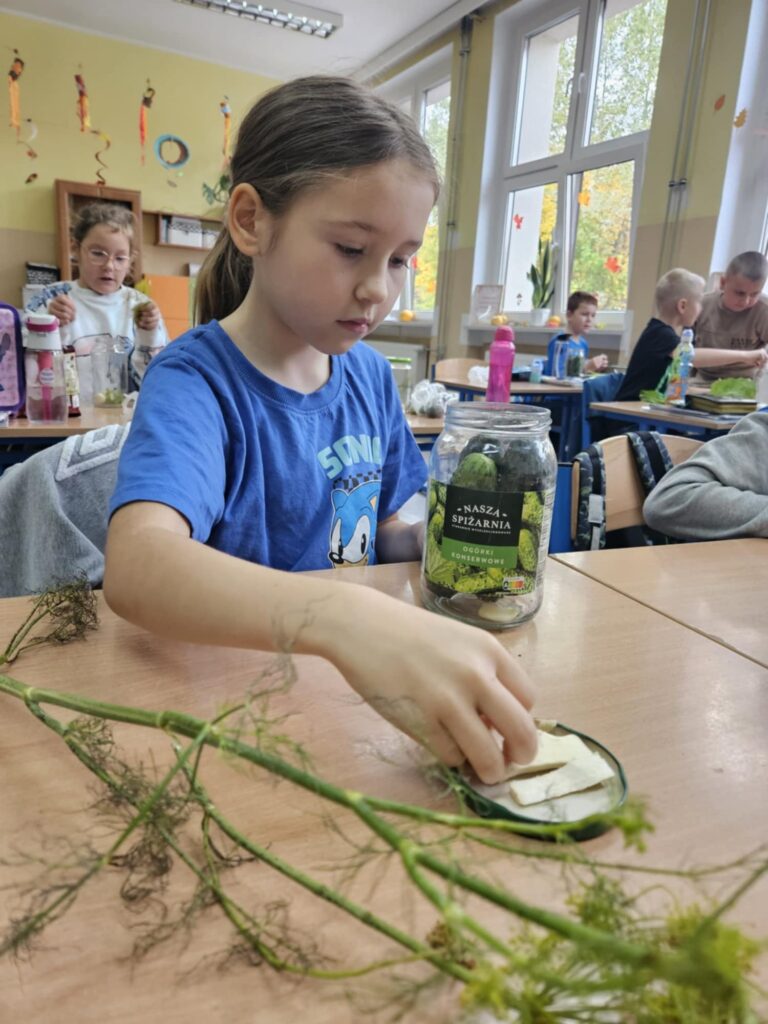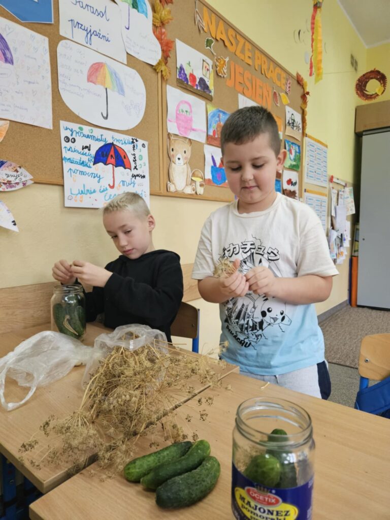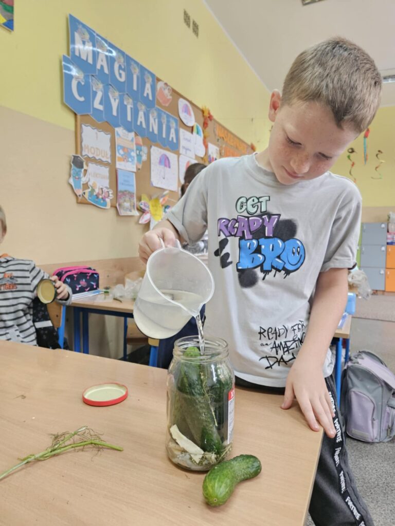 Uczniowie klasy 2b na ostatnich zajęciach przyrody zamienili się w małych kucharzy i robili kiszone ogórki.