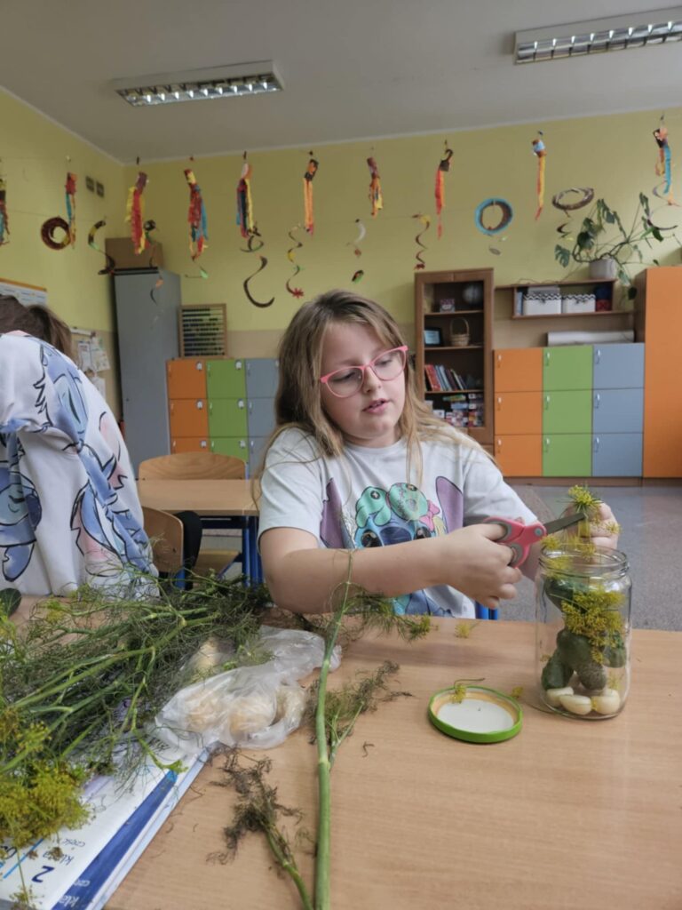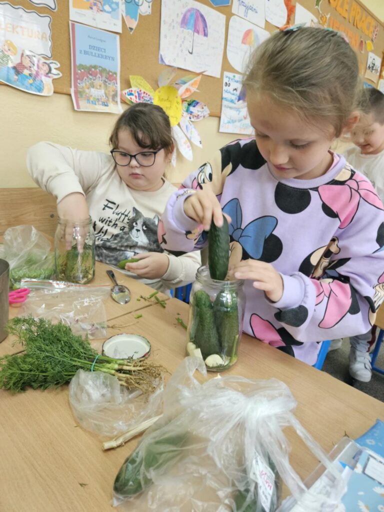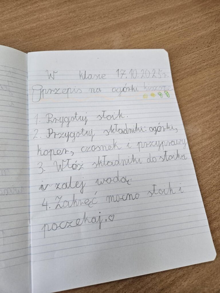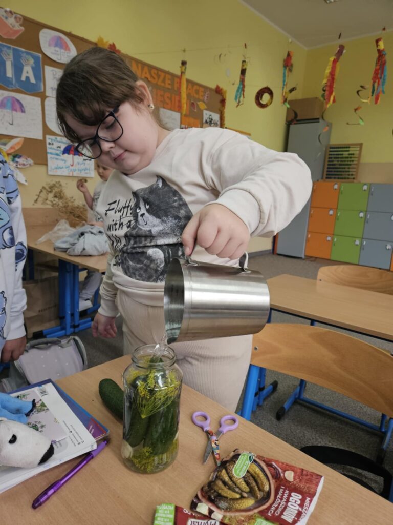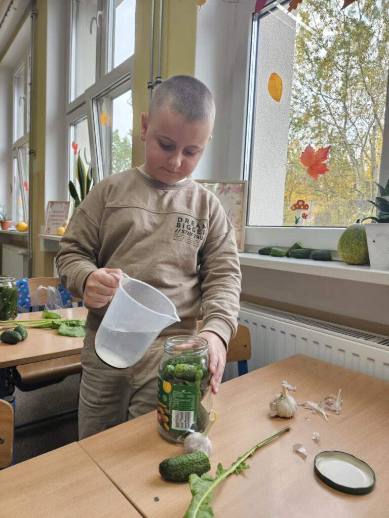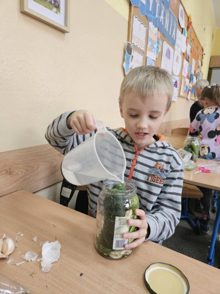 Na zajęciach były też elementy edukacji polonistycznej. W pierwszej kolejności zastanowiliśmy się nad planem kiszenia i zapisaliśmy go w kilku krokach w zeszycie. Następnie dzieci przygotowały niezbędne składniki oraz słoiki i zabrały się do pracy.